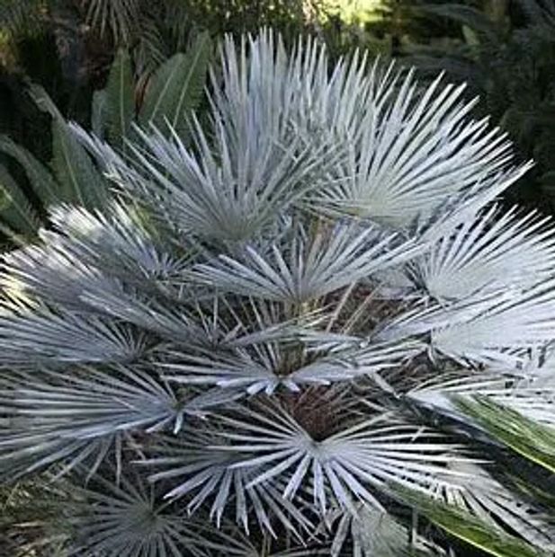 Chamaerops Humilis v. Cerifera is an evergreen, low maintenance palm from 5000 ft. in the Atlas Mountains of Morocco hardy to about 5 degrees F or more when mature. It is very similar in appearance to the normal Chamaerops Humilis except that the narrow, fan palm leaves are a different colour. Chamaerops V. Cerifa are a lovely, pale blue color which becomes more vivid as they mature. They start off with green leaves, progressing to blue.